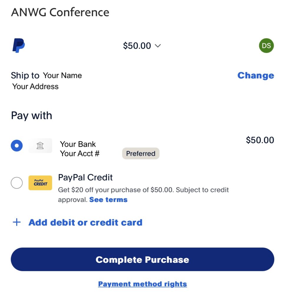 Conference payments are processed by PayPal. The payment screens may be confusing, but you do NOT need a PayPal account. You simply need to carefully navigate the screens and buttons to pay without having or creating an account. (If you have a PayPal account and want to use it you can see below for more information.)