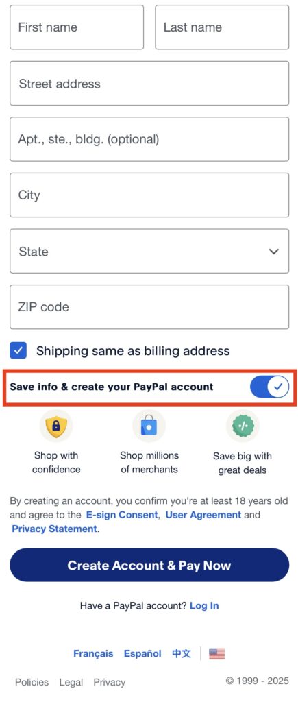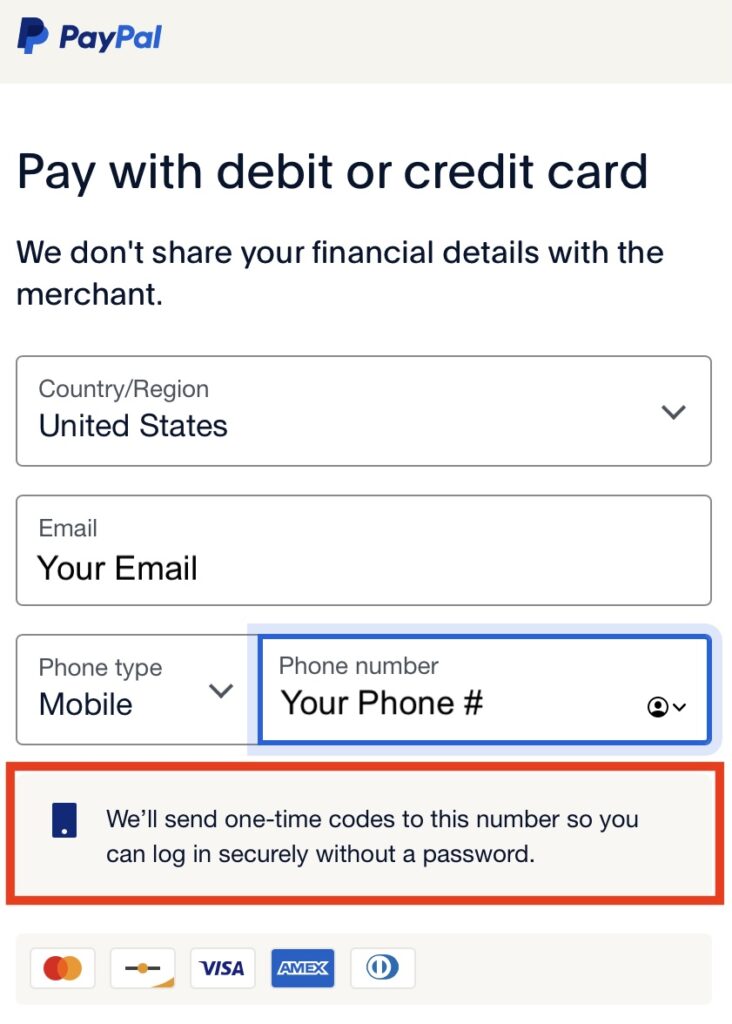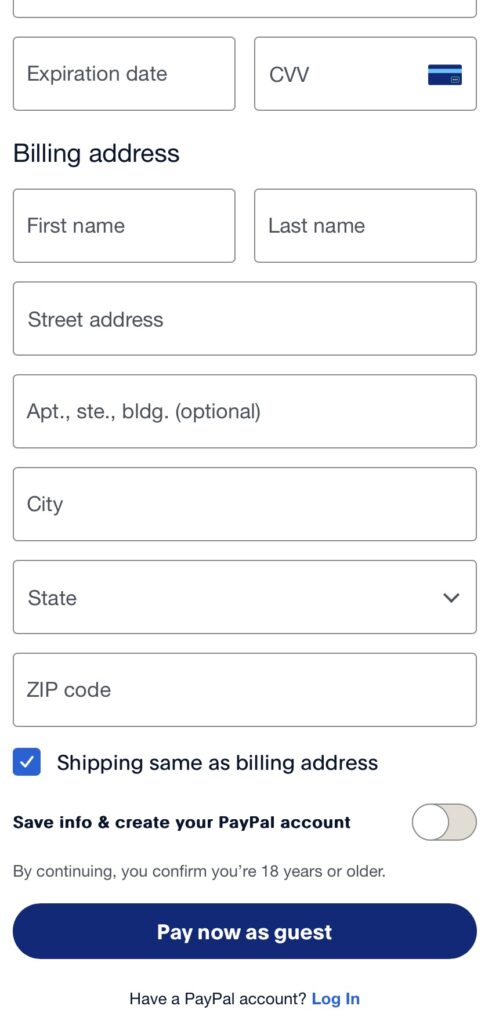 When the information is entered and you’ve disabled the PayPal account creation you will get a new button that says “Pay now as guest.” You can fill in your credit card information and proceed with your payment. If you entered a cell phone number PayPal will text a code to your phone, and on the next screen will prompt you to enter the code before it will proceed. If you entered a home or work number the system will just proceed and process the payment.