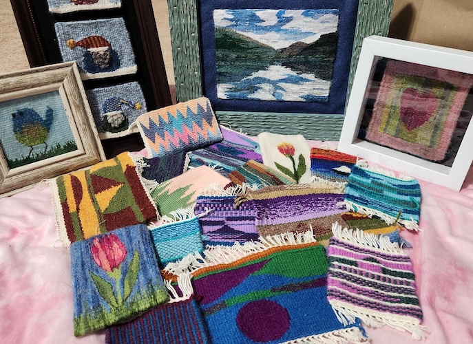 Come spend 3 days immersed in the wonderfully creative world of tapestry. We will dive right in making mini tapestries as we learn, explore and play. Our goal is to go home with a love of tapestry, and a proficient skill and knowledge base of tapestry fundamentals. In this workshop we will explore these topics: weaving materials and resources (warp, weft, looms and tools), preparing to weave (warping, set, multiple headers and footers, nature of tapestry weaving), techniques (stripes, meet and separate, hatchures and hatching, dots, advancing and receding in regards to hill and valley threads, pigtails, soumak, twining, joinings, fixing sheds, outlining, edge and turn management, interlocks) structures (weaving line by line, direction of weaving, shape building, angles, curves, circles), color (value, gradations, weft bundling, hatching, dots), design ( ideas, planning and cartoon development), finishings (sewing slits, sewing in ends, steaming, covering back, fringe and knots, hanging, framing). After this class you will be well on your way to becoming a TAPESTRY WEAVER!